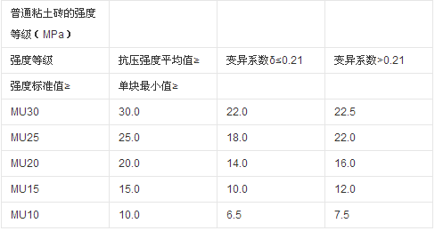 2、強(qiáng)度等級(jí)。強(qiáng)度等級(jí)根據(jù)10塊磚的抗壓強(qiáng)度平均值、標(biāo)準(zhǔn)值或最小值劃分,共分為MU30、MU25、MU20、MU15、MU10五個(gè)等級(jí),在評(píng)定強(qiáng)度等級(jí)時(shí),若強(qiáng)度變異系數(shù)δ≤0.21時(shí),采用平均值——標(biāo)準(zhǔn)值方法;若強(qiáng)度變異系數(shù)δ>0.21時(shí),則采用平均值——最小值方法。其具體要求如下表所示。