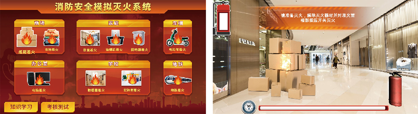 滅火器內(nèi)含傳感器,體驗(yàn)者通過真實(shí)拿起滅火器并進(jìn)行使用的動作,進(jìn)行虛擬滅火的操作。系統(tǒng)提供不同的著火場景,體驗(yàn)者可選擇不同的滅火器,從而熟知使用滅火器進(jìn)行滅火的步驟,系統(tǒng)會對體驗(yàn)者的操作進(jìn)行評分和錯誤糾正。
